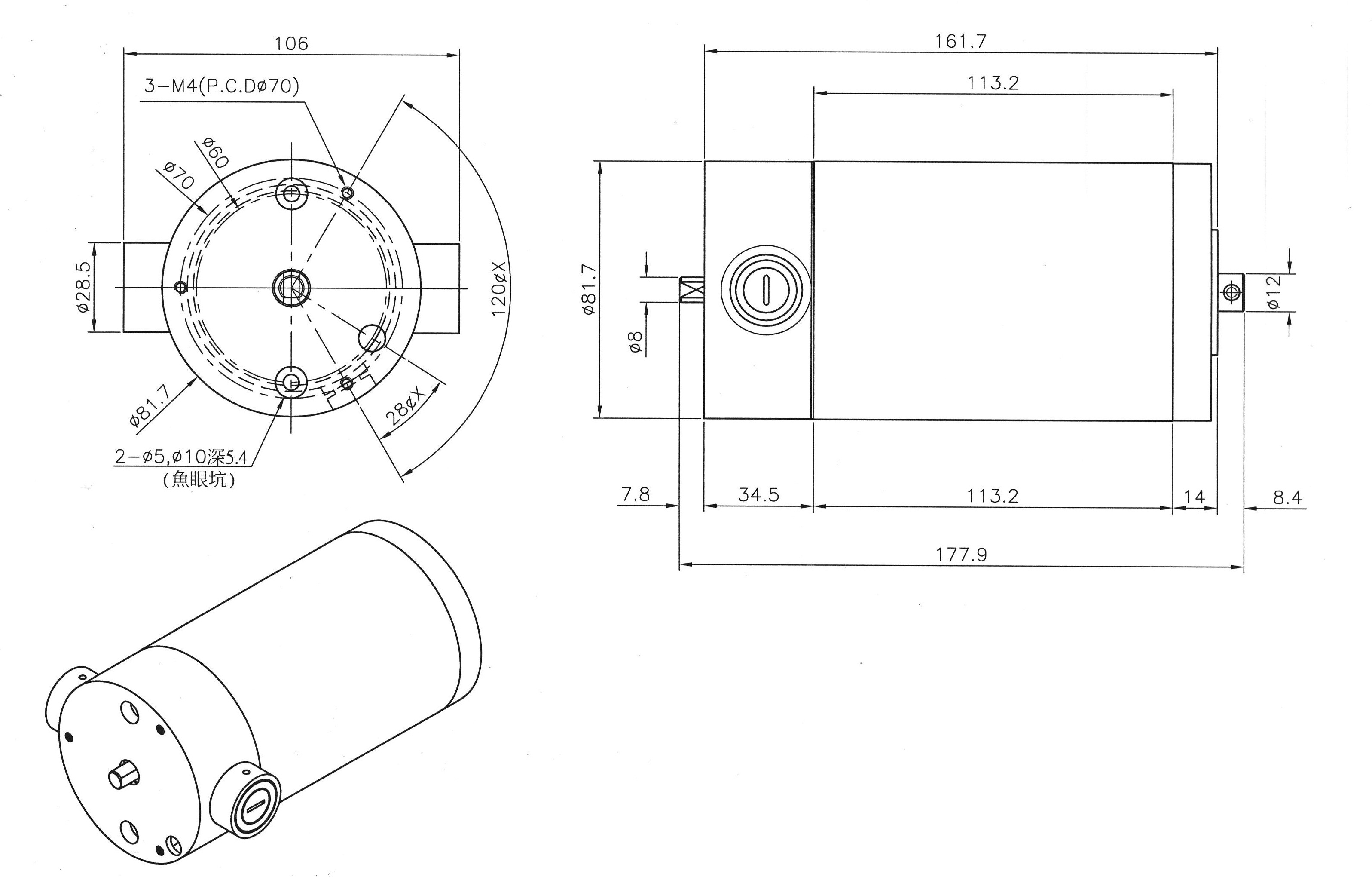 身体障害者用電動車の駆動用 5370 主な用途:このモータは、身体障害者用電動車の駆動用して開発しました。 機種名 5370 電圧 DC/24V 出力(W) 420W 電流 17A 無負荷回転数 3600 外形・寸法 Φ82 x 160